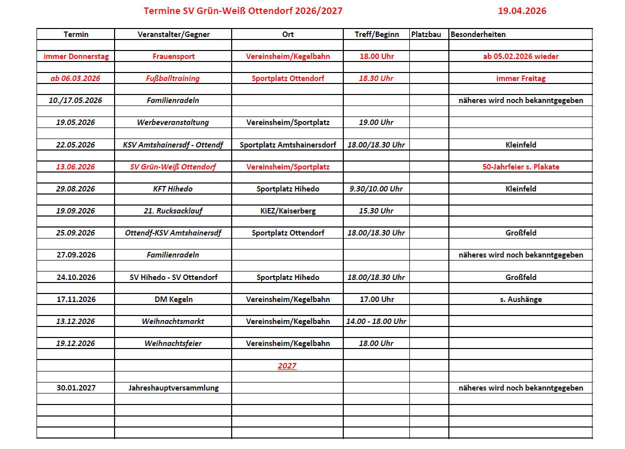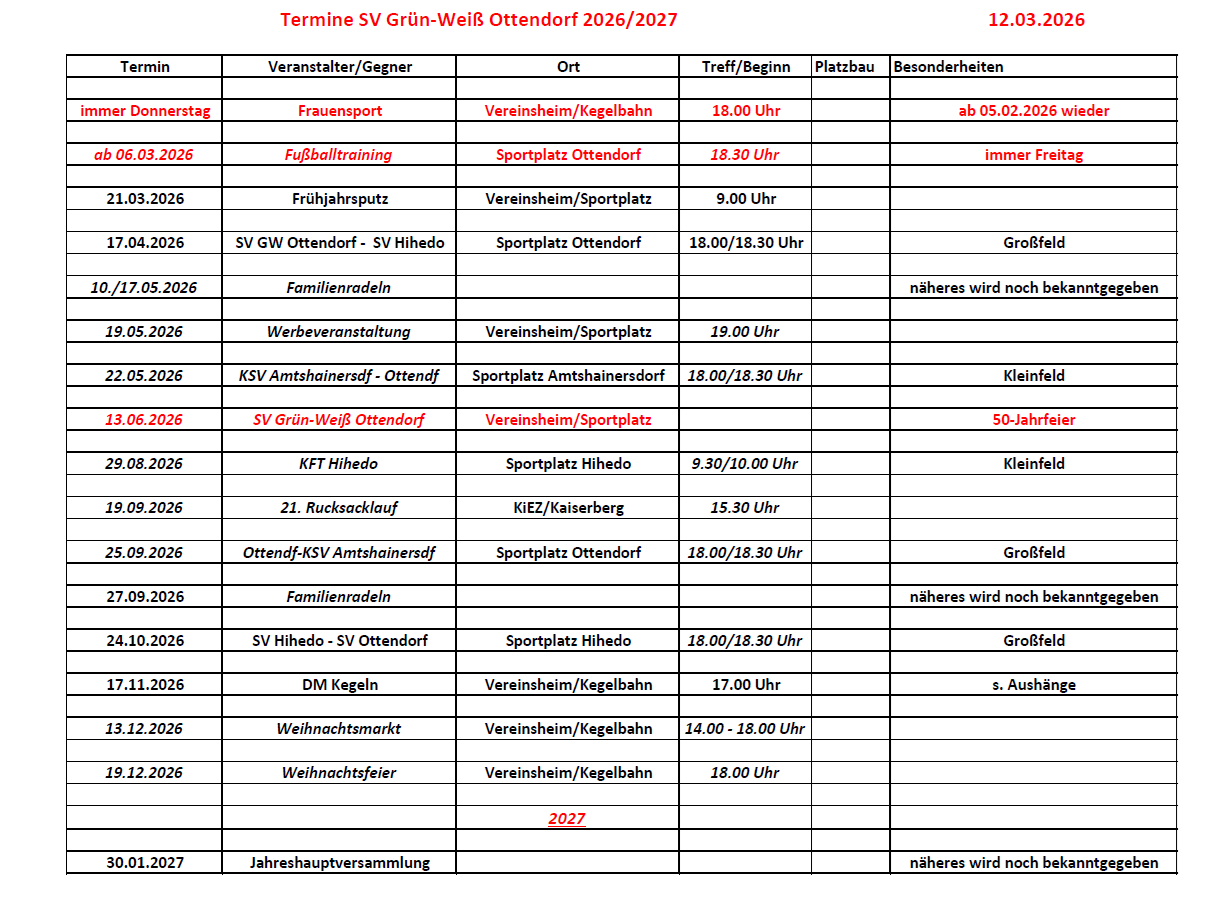Termine SV Grün-Weiß Ottendorf 2026-2027