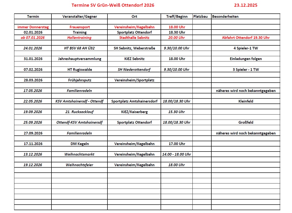 Termine SV Grün-Weiß Ottendorf 2026