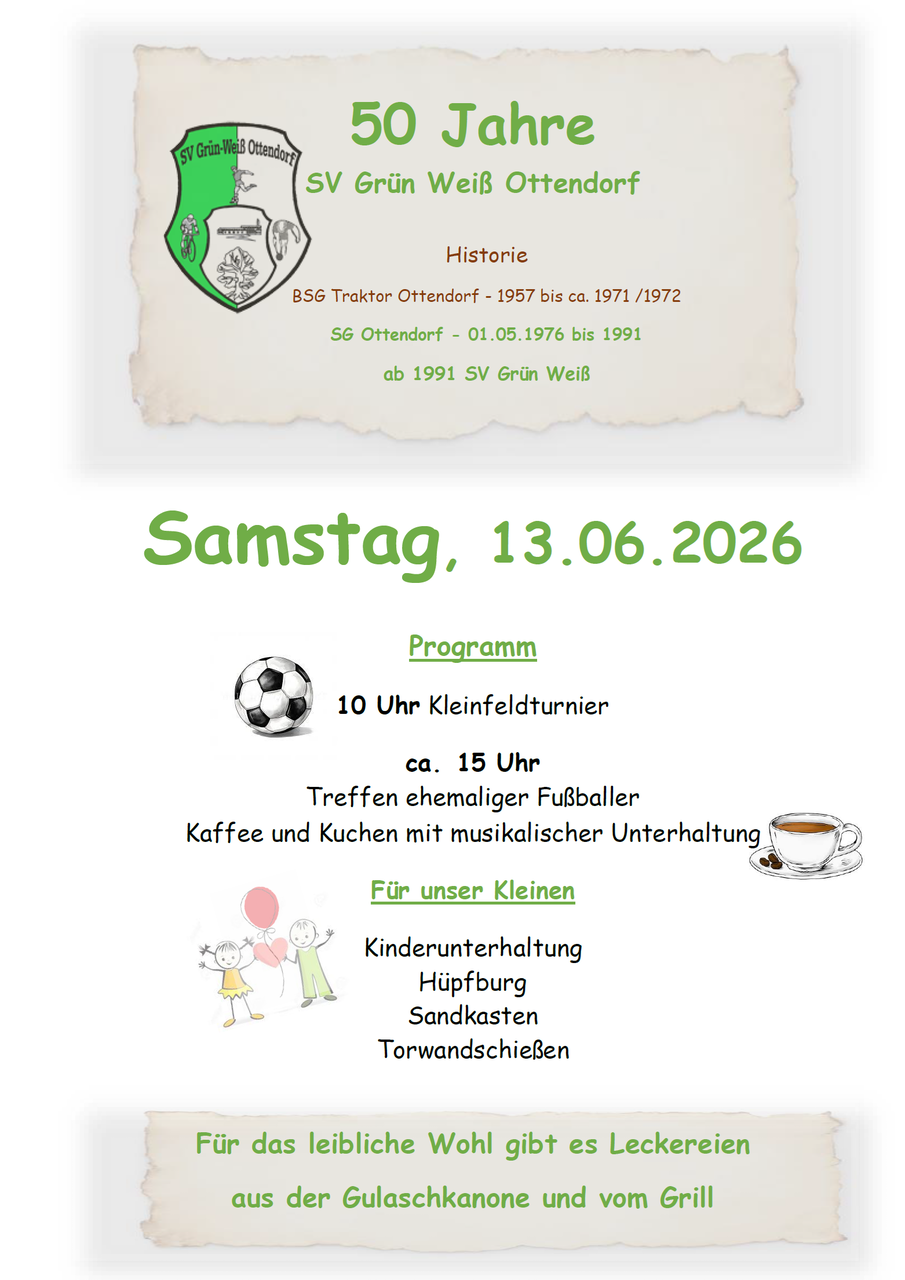 Hiermit laden wir alle, zur 50-Jahrfeier des Sportvereines Ottendorf, am 13. Juni 2026, recht herzlich ein.