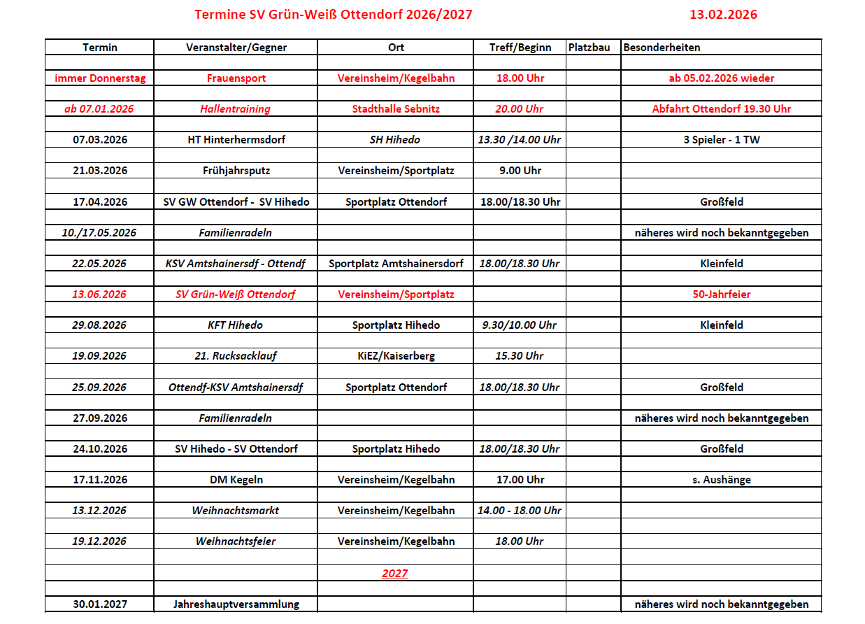 Termine SV Grün-Weiß Ottendorf 2026-2027